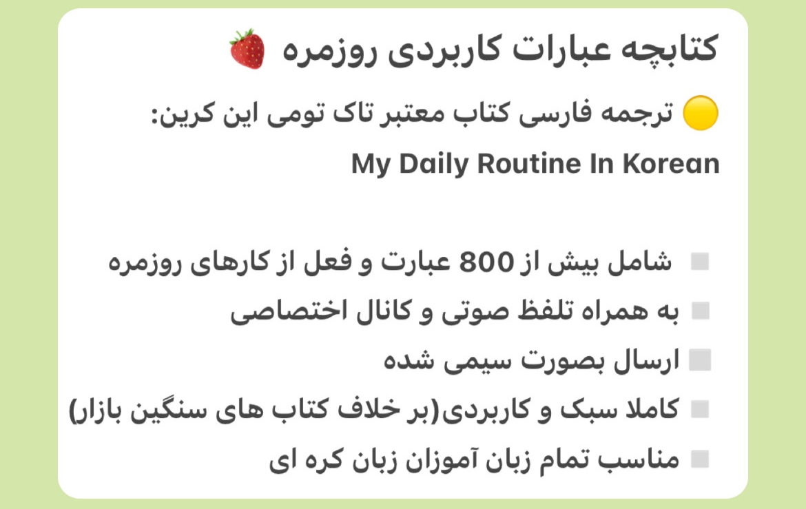 شامل بیش از 800 عبارت و فعل از کارهای روزمره که توی طول روز انجام میدیم ( ترجمه فارسی کتاب روتین از انتشارات معروف تاک تومی این کرین)🍋🍃